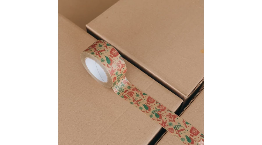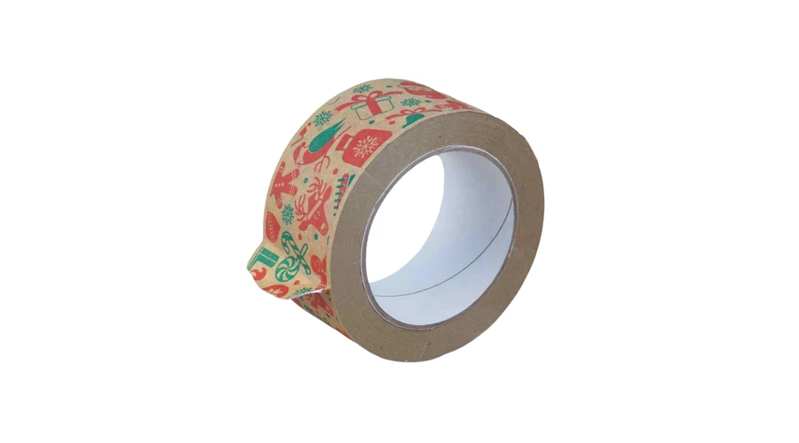 Ünnepi mintás Eco karácsonyi ragasztószalag 50 mm × 50 m méretben, solvent (természetes kaucsuk) ragasztóval. Erős tapadása ideálissá teszi dobozok, csomagok és ajándékcsomagolások lezárásához. Környezetbarát papír alapja és megbízható zárása miatt tökéletes választás a fenntartható, esztétikus csomagoláshoz karácsonyi időszakban is. |